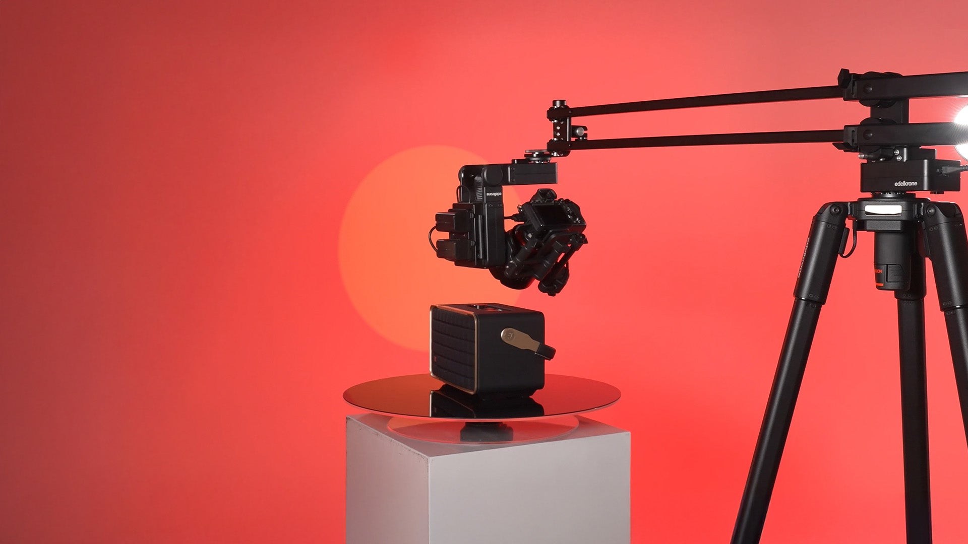 Tripod X, with its motorized height adjustment, makes working with JibONE a breeze. Adding the edelkrone Tripod Wheels allows you to effortlessly position the entire setup anywhere in the studio and set it up at any height with ease.